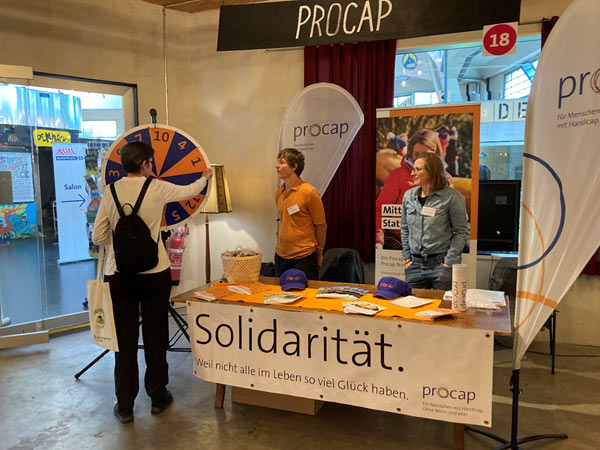 Am 25. September war Procap Nordwestschweiz mit einem Stand am diesjährigen Marktplatz 55+ in Basel präsent. Unter dem Motto "Solidarität. Weil nicht alle im Leben so viel Glück haben“ wurde aktiv für die Solidarmitgliedschaft geworben. Das Glücksrad hat viele Besuchende animiert, ihr Glück zu versuchen und es ergaben sich interessante Gespräche. Wer sich für eine Solidarmitgliedschaft interessiert oder einen Freundeskreis hat, der Menschen mit Behinderung unterstützen möchte, kann sich hier anmelden.